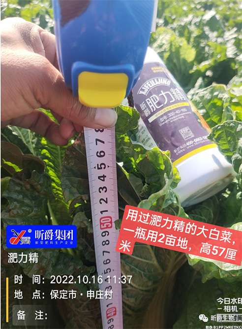 今天我们来说说,白菜包心和高度的一些技巧,下图来自河北保定,图中正在测量用过翡利晶的白菜高度 ,从图片可以看出用过翡利晶的白菜是60公分,没用的是40公分,这是品种、播种时间、天数都是一模一样的情况下,但是结果是不一样的。