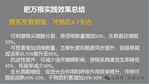 水溶肥厂家昕爵生产的生根肥“肥万根”,不仅直接补充植物生根的一种特殊物质“根肽元”,生根壮根,同时含有大量有机碳,维持土壤碳氮平衡,使作物根系延缓衰老,提高其抗ni能力,强li生根、cu长、增侧根,侧根增多快速增加根系群,愈合伤口促进幼苗、主根伸长和加粗,huo化土壤、松土养地、排斥重金属离子,提高作物的抗ni能力。