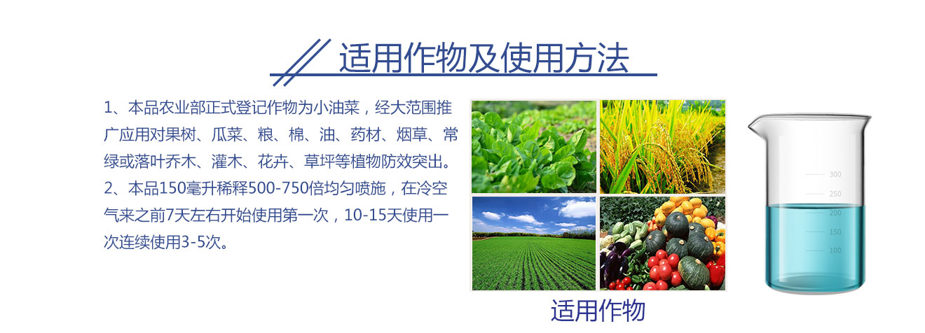 1、本品农业部正式登记作物为小油菜,经大范围推广应用对果树、瓜菜、粮、棉、油、药材、烟草、常绿或落叶乔木、灌木、花卉、草坪等植物防效突出。