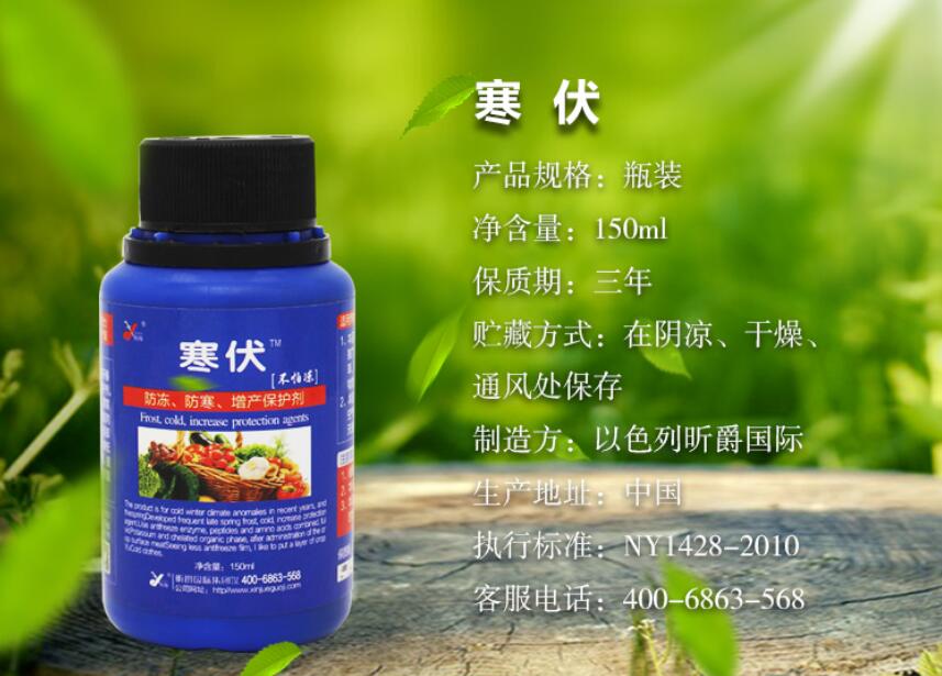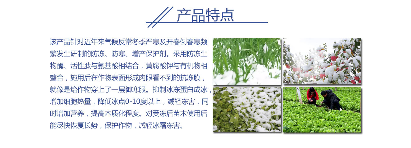 该产品针对近年来气候反常冬季严寒及开春倒春寒频繁发生研制的防冻、防寒、增产保护剂。采用防冻生物酶***肽与氨基酸相结合,黄腐酸钾与有机物相螯合,施用后在作物表面形成肉眼看不到的抗冻膜,就像是给作物穿上了一层御寒服。抑制冰冻蛋白成冰,增加细胞热量,降低冰点0-10度以上,减轻冻害,同时增加营养,提高木质化程度对受冻后苗木使用后能尽快恢复长势,保护作物,减轻冰霜冻害。
