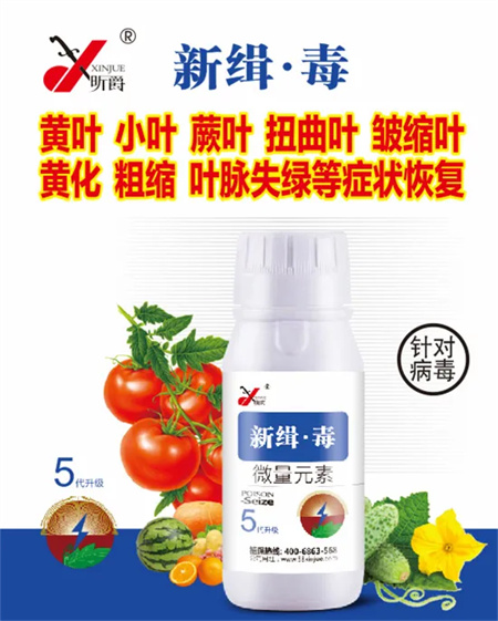 昕爵集团的这款微量元素新缉·毒,采用植物提取物与多种元素螯合而成,针对作物黄叶、小叶、蕨叶、扭曲叶、皱缩叶、黄化、粗缩、叶脉失绿等症状有良好的恢复作用。适用于瓜果菜、粮棉油、烟草、花卉、药材等作物,100克新缉·毒兑水60~90公斤,稀释后均匀喷雾,7~10天使用一次连续使用2~3次,有效防治作物病毒病。