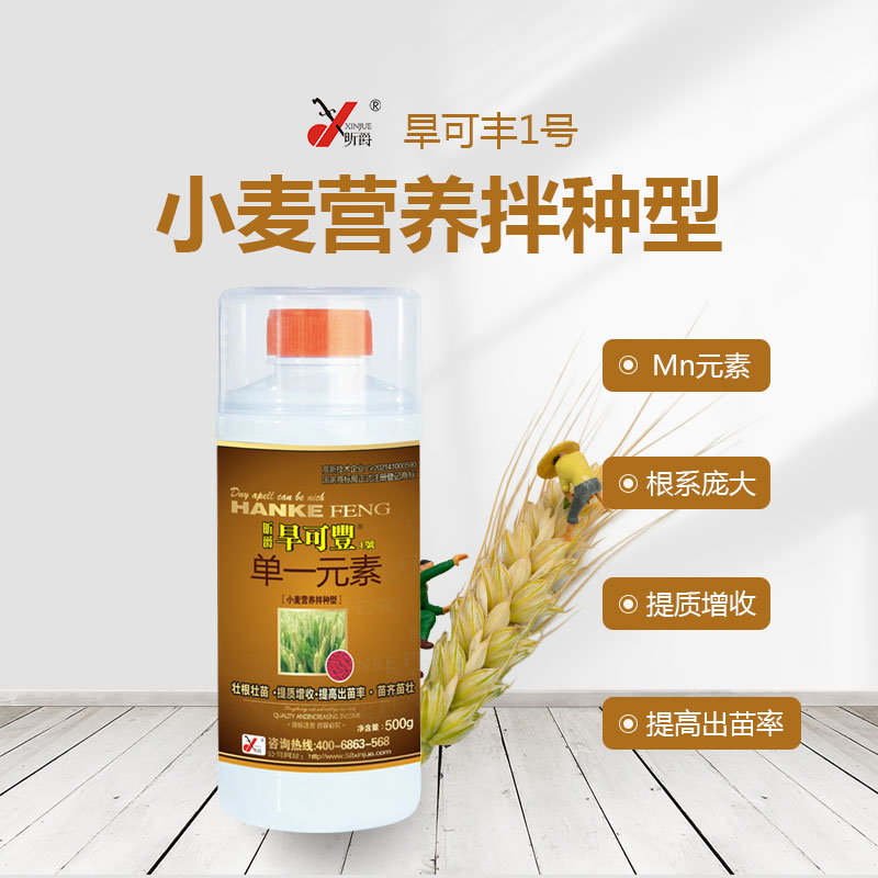 旱可丰营养型小麦拌种剂是根据近年温度逐年变暖和气温升高、土地贫瘠、土壤破坏严重而开发研制的一种营养型拌种产品,内含植物丰产锰(Mn)元素,采用螯合技术研制而成,能促进作物生长、壮根壮苗、增加产量效果好,在中国不同地区 小麦的使用和示范中都取得了良好的效果。