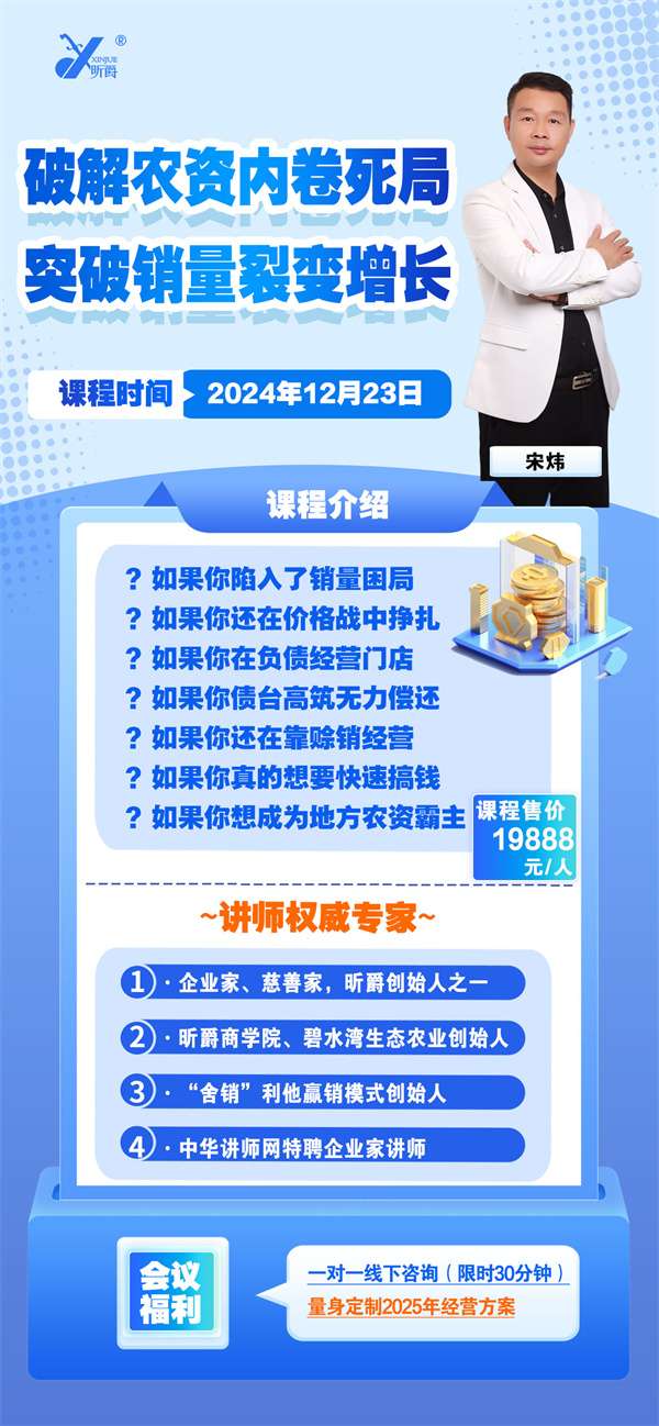 昕爵集团24届高科技新农业“化肥减量增收”高峰论坛暨新特产品发布会,将于12月22日签名报道,23日《破解农资内卷死局 突破销量裂变增 长》专题会,由昕爵集团董事长、企业家、慈善家,昕爵集团创 始人之一——宋炜先生主讲,宋炜先生是昕爵商学院创 始人、碧水湾生态农业创 始人、中国爱农农资商会会长、“舍销”利他赢销模式创 始人、中华讲师网特聘企业家讲师、中国肥料协会理事,大量农资企业经营案例+企业实战研讨,被学员称为“行走的农资界案例库”,2025年,农资市场将进入转型期和洗牌期,本次会议将为您如何应对带来答案。