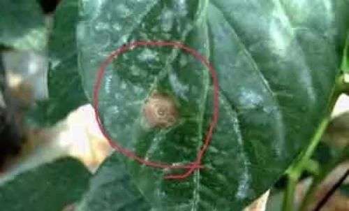 发病症状: 辣椒炭疽病主要为害果实和叶片,也可侵染茎部。叶片染病,初呈水浸状褪色绿斑,后逐渐变为褐色。病斑近圆形,中间灰白色,上有轮生黑色小点粒,病斑扩大后呈不规则形,有同心轮纹,叶片易脱落。果实染病,初呈水渍状黄褐色病斑,扩大后呈长圆形或不规则形,病斑凹陷,上有同心轮纹,边缘红褐色,中间灰褐色,轮生黑色点粒,潮湿时,病斑上产生红色粘状物,干燥时呈膜状,易破裂。