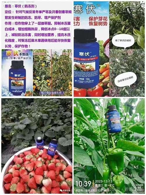 为了产量和品质,需要采取一系列措施来增强植株长势,包括增设补光灯、清洁棚膜、铺设地膜、水分管理、安装加热设备等。也可以通过科学施肥来提高瓜果蔬菜***抗冻能力!现给大家推荐一款号称“作物的羽绒服”——水溶肥厂家生产的新型植物防冻剂寒伏。主要作用是,***生物酶,杀灭或阻止冰核细菌生成和繁殖,在降温时维持生物膜结构稳定性,减少和减轻低温对膜的破坏,降低植物细胞冰点值,增强植株保水和抗冻能力,抑制和破坏冰冻蛋白,增加热量,降低结冰能力,提高植株对低温的抵抗力。植物抗冻剂能显著提高绿色植物、蔬菜、香蕉、雪松、绿篱、柑桔、龙眼、荔枝、茶叶、水稻等作物及各种果树、苗木的抗病抗低温、倒春寒的抗冻能力,有效地防止早晚霜袭击,避免或减轻受冻害。对被的植物可迅速直到恢复树势、恢复作物正常的生长修复作。